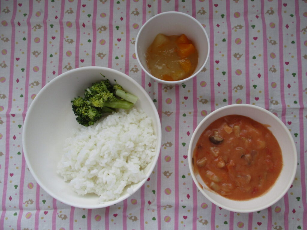 今日の給食♪ごはん、トマトクリームシチュー、ごま塩ブロッコリー、フルーツゼリー