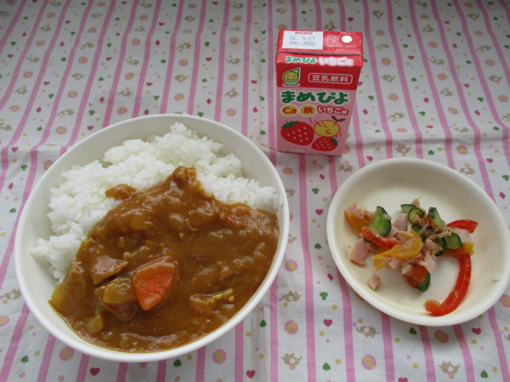 <2/6(金)の献立>カレーライス・野菜のマリネ・まめぴよ