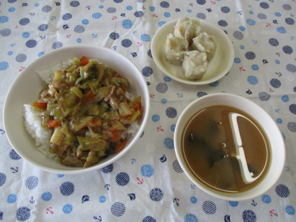 <今日の献立>中華丼・野菜しゅうまい・みそ汁