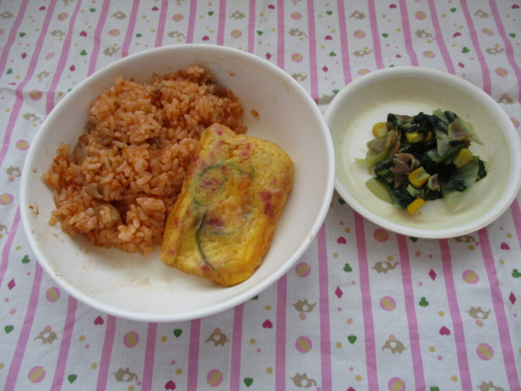 今日の献立♪ チキンライス、オムレツ、ポパイソテー