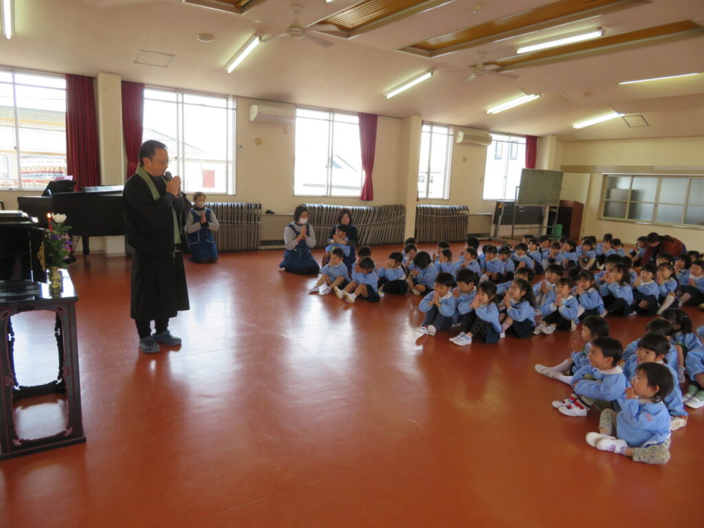 本堂で献花・献灯をし、園長先生のお話を聞きました。