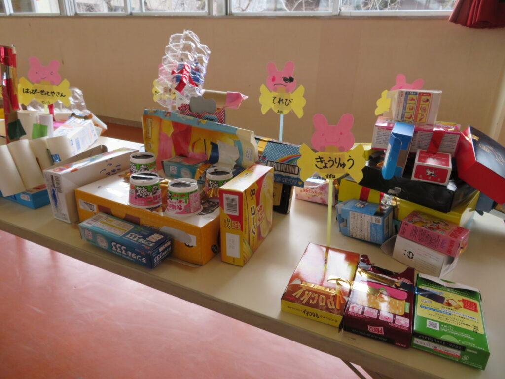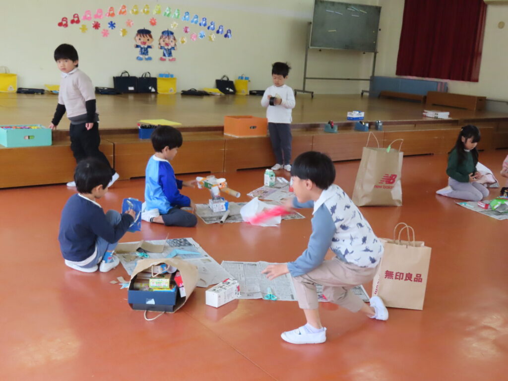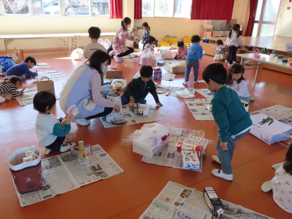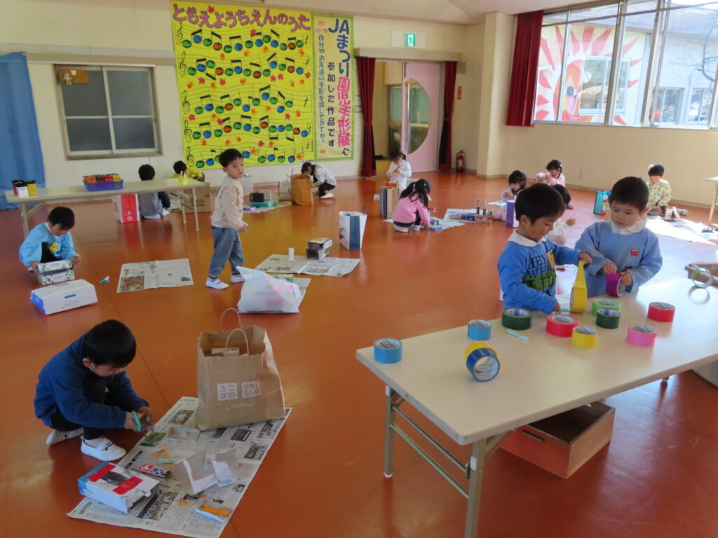 空き箱やカップなどを使って製作をします。