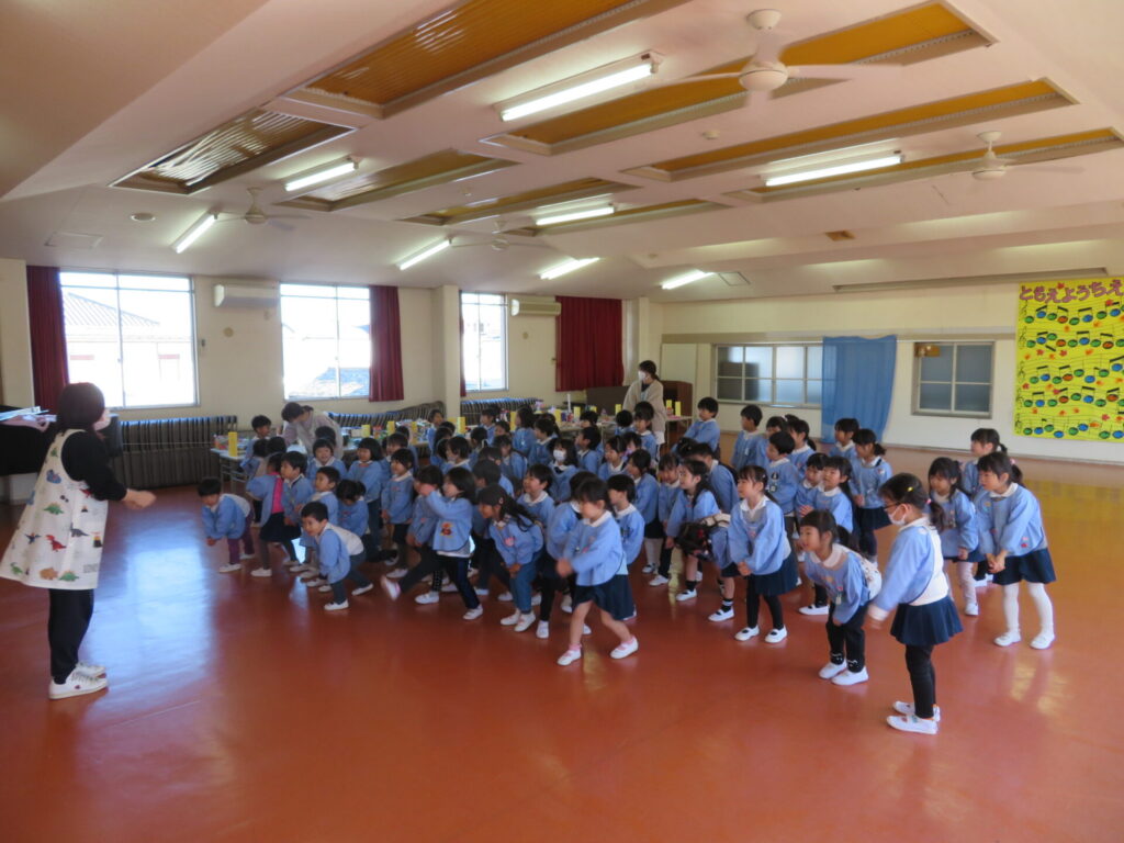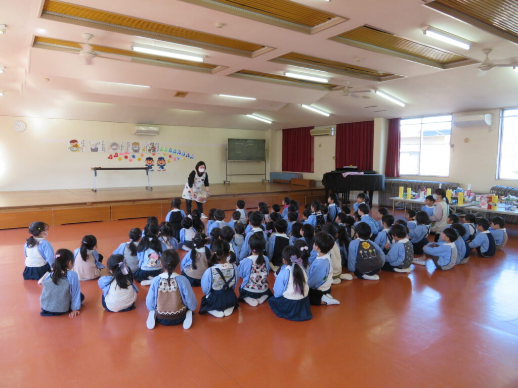 お遊戯室でおもちができるまでのお話を聞きました。もちつきの歌もうたったよ🎵