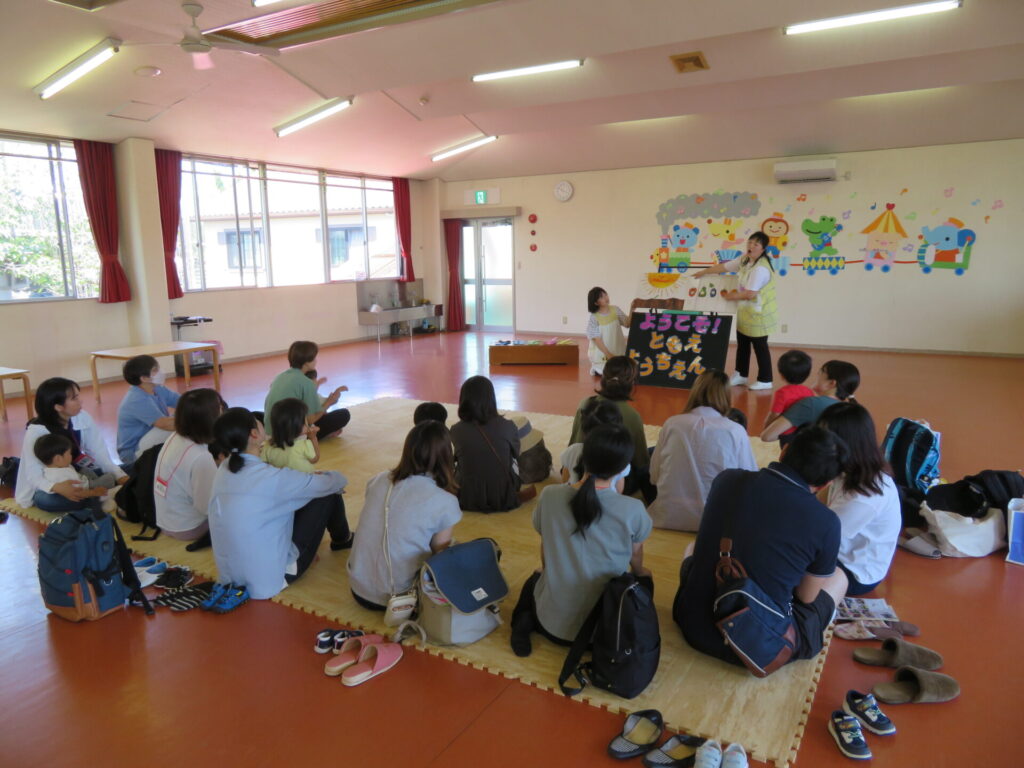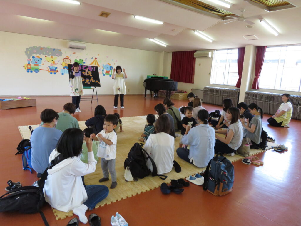 先生と一緒に手遊びをしたり、「はらぺこあおむし」のお話を聞いて楽しみました。