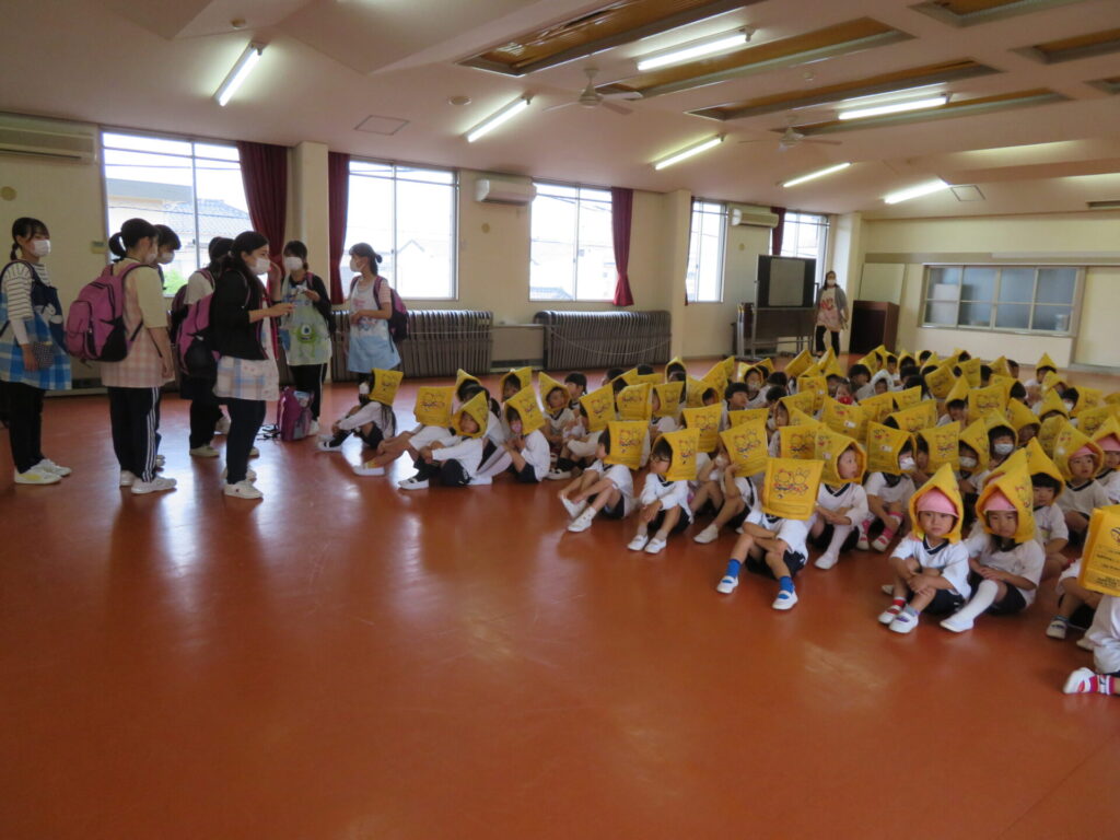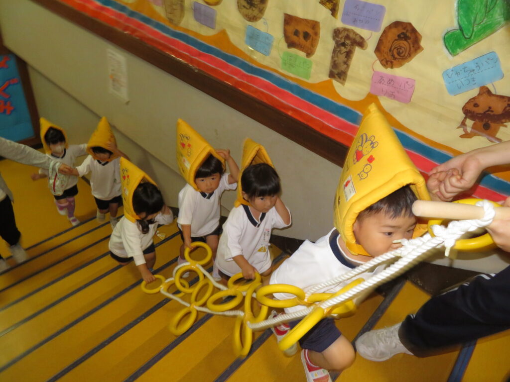 雨の日だったのでお遊戯室に避難してお話を聞きました。