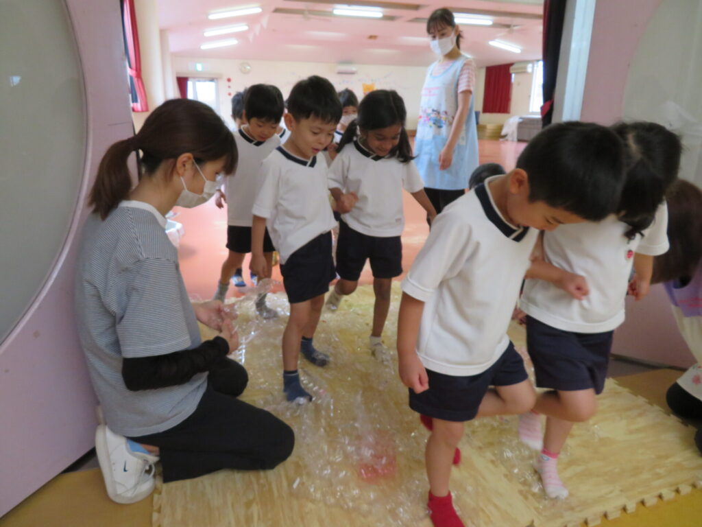 割れたガラスを踏む感覚の体験で、年長さんのみ上靴を脱いで卵パックを踏んでもらいました👣