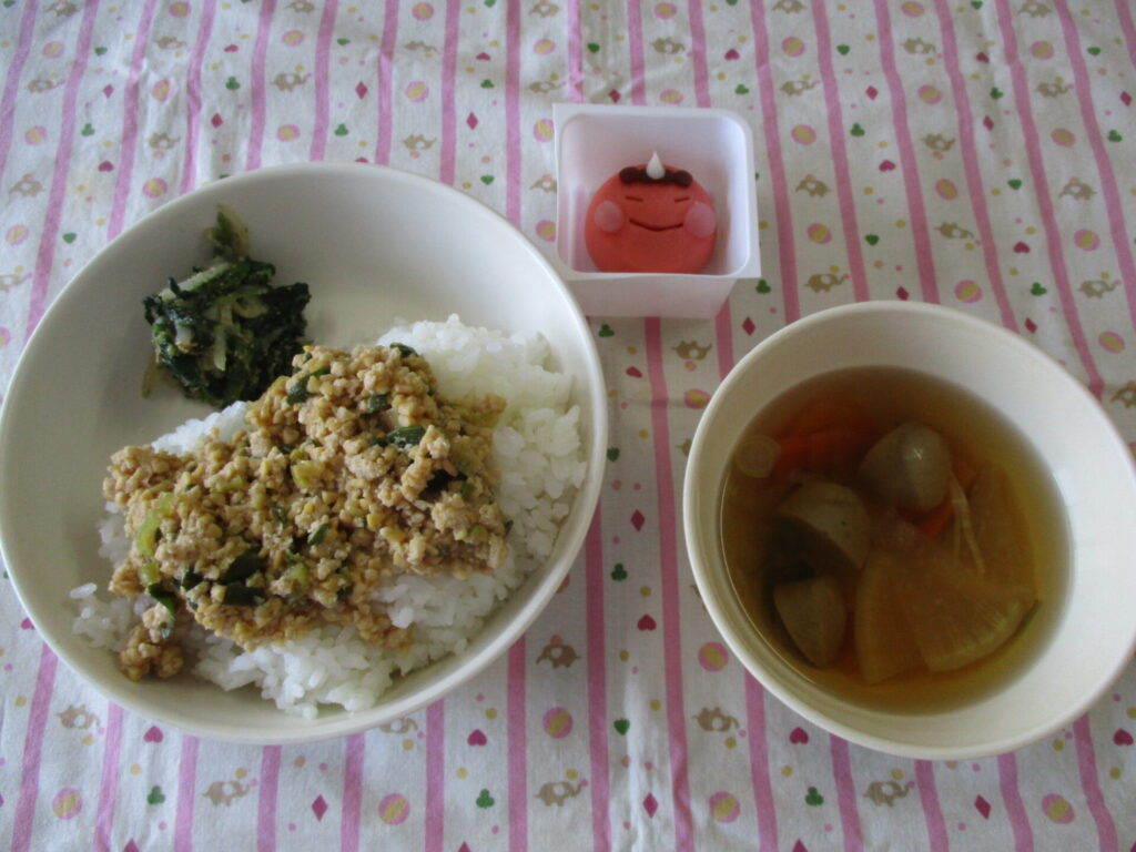 今日の献立☆スタミナ納豆丼、野菜のごま和え、いわしのつみれ汁、節分和菓子