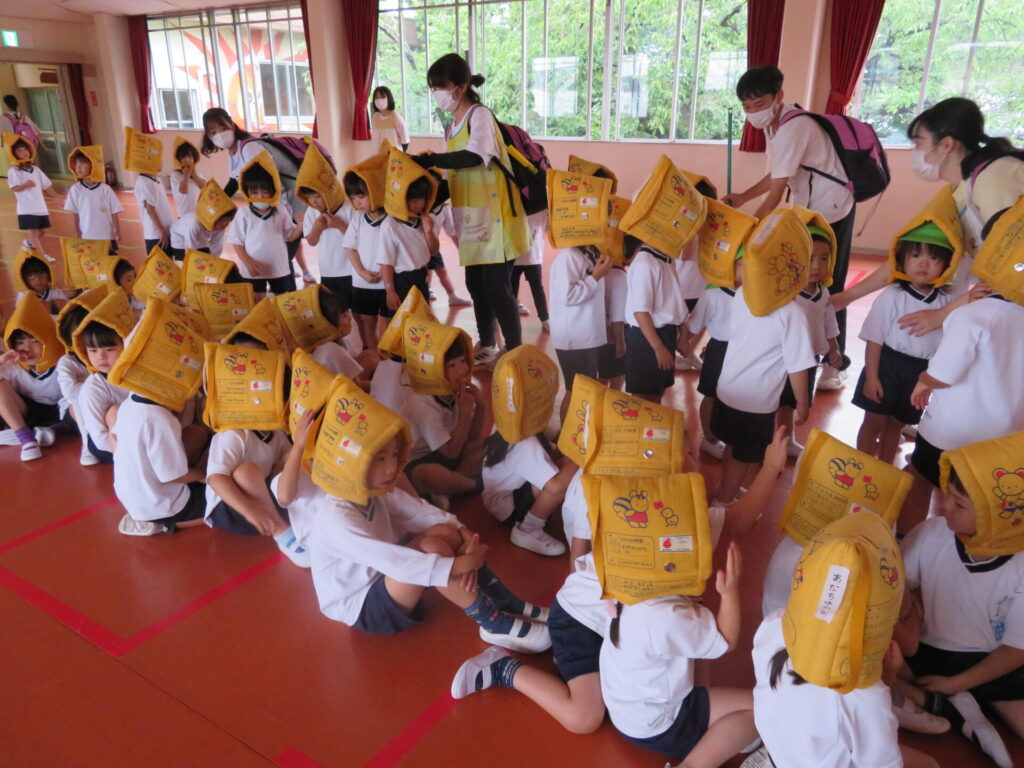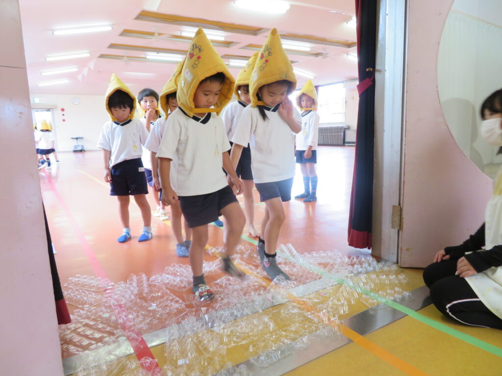地震の避難訓練です。年長さんは卵のパックを踏み、ガラスを踏んだ感触を体験してもらいました。