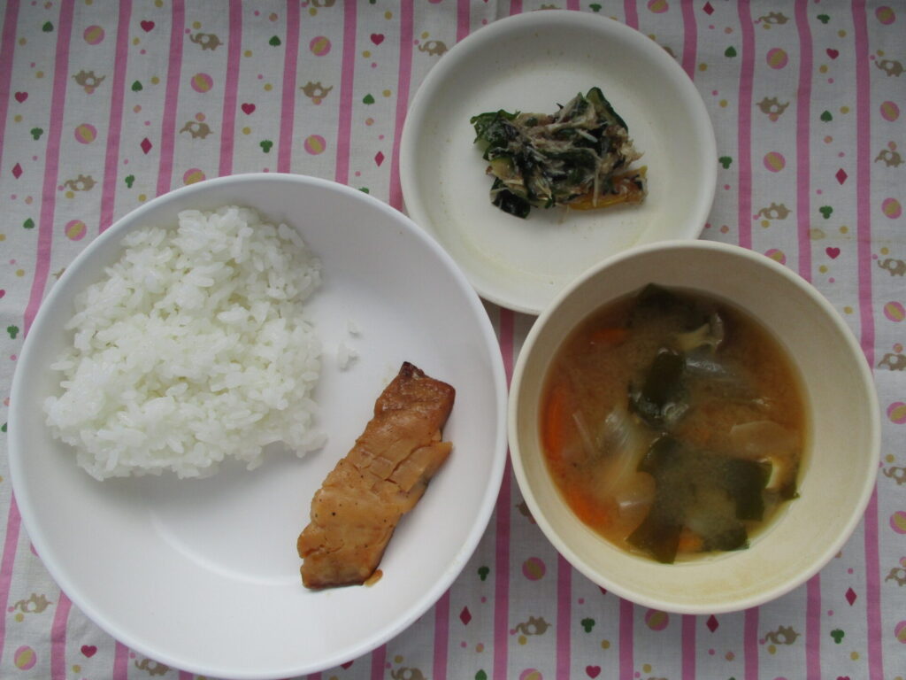 今日の給食は、ごはん、さかな、和え物、みそ汁と