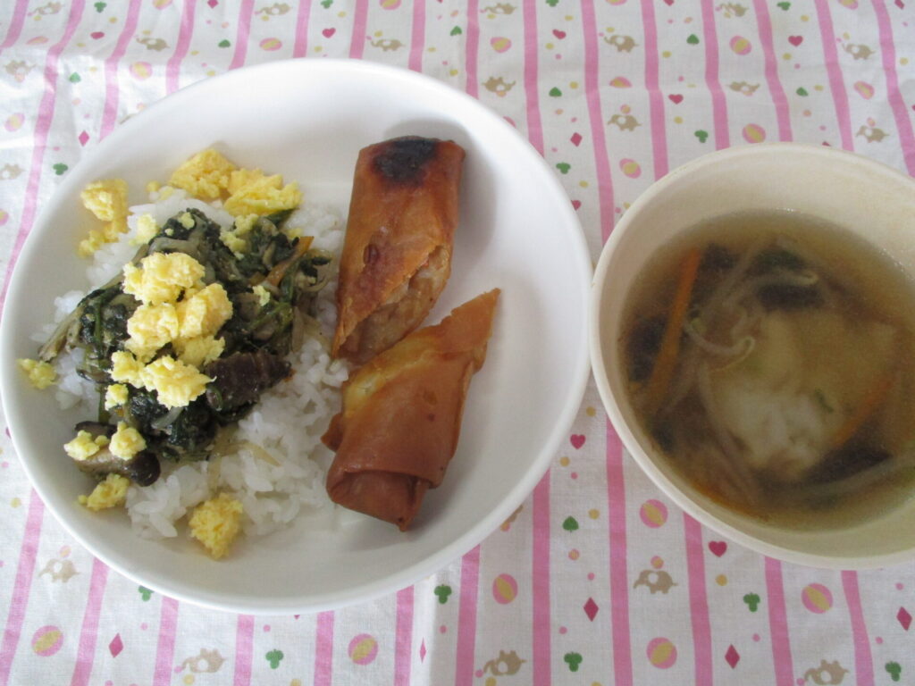 ビビンバ丼と春巻き、スープで量も丁度良かったです。