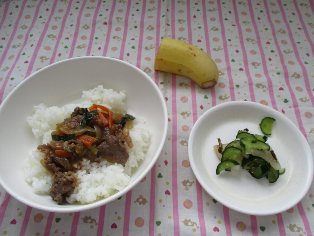 <今日の献立>プルコギ丼・大根ときゅうりの浅漬け・バナナ