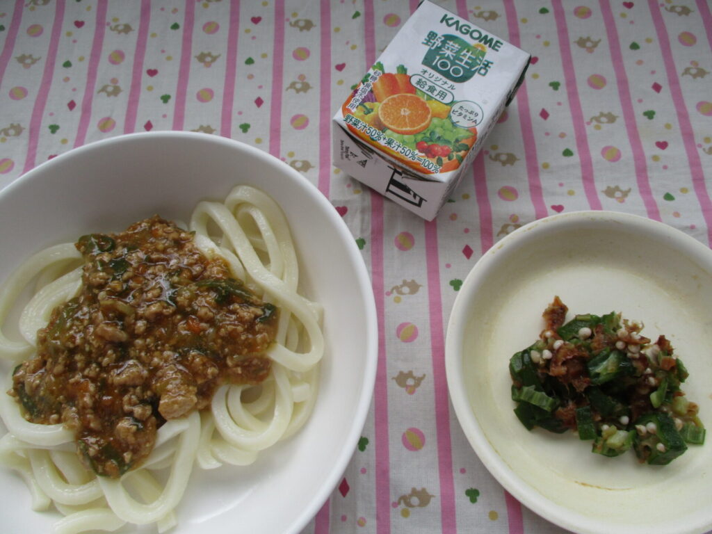 <今日の献立>肉味噌うどん・オクラのおかか和え・野菜生活