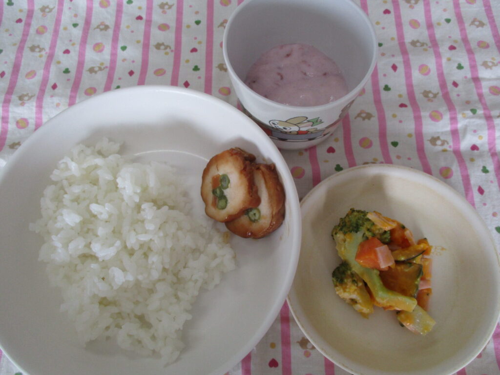 <今日の献立>ごはん・チキン二色巻・かぼちゃのコブサラダ・いちごのフルーチェ