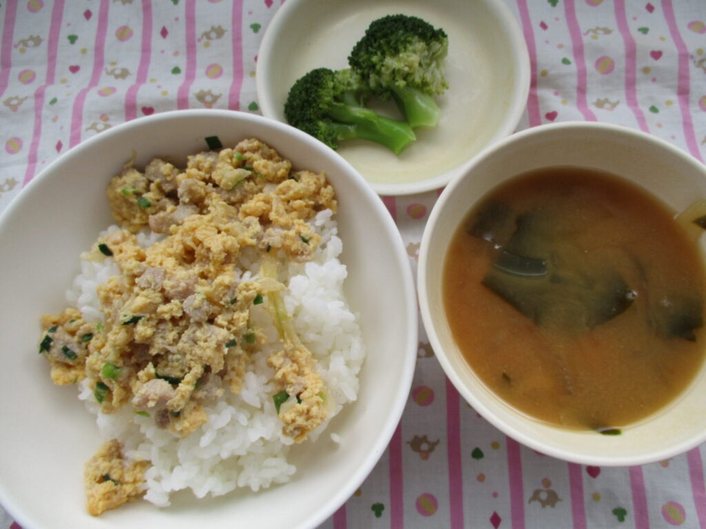 親子丼、ブロッコリーのナムル、みそ汁