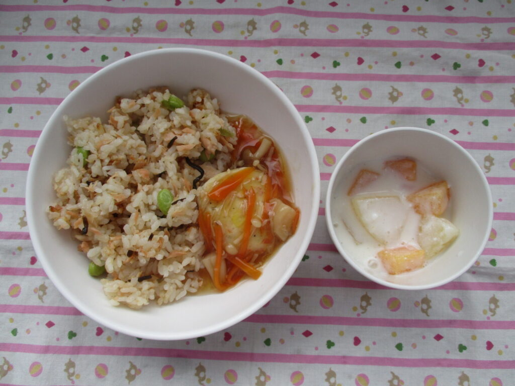 今日の献立♪鮭と枝豆のご飯、豆腐のふわふわ、フルーツヨーグルト