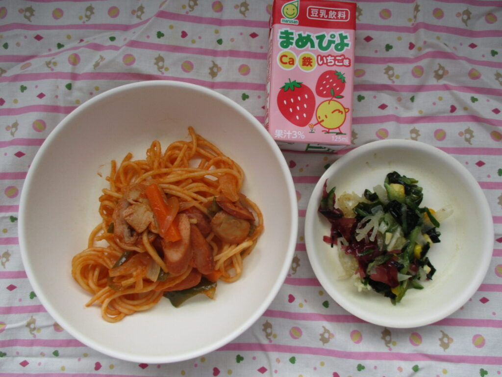 今日の献立♪ナポリタンスパゲッティ、海藻サラダ、まめぴよ