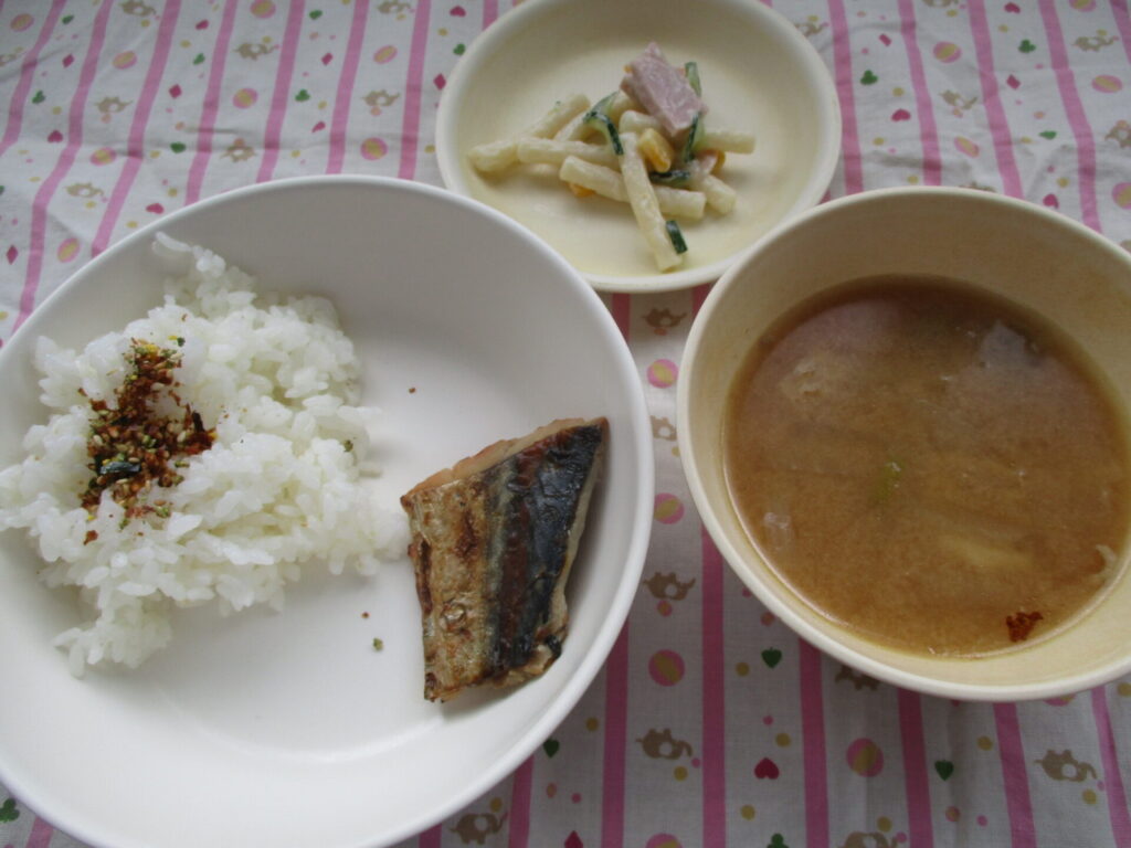 <今日の献立>ご飯・マカロニサラダ・さわらの西京焼き・豚汁