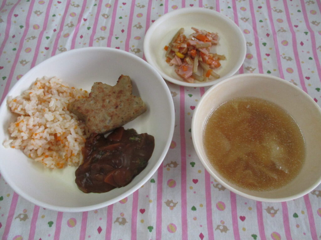 <今日の献立>人参ピラフ・デミグラスソースハンバーグ