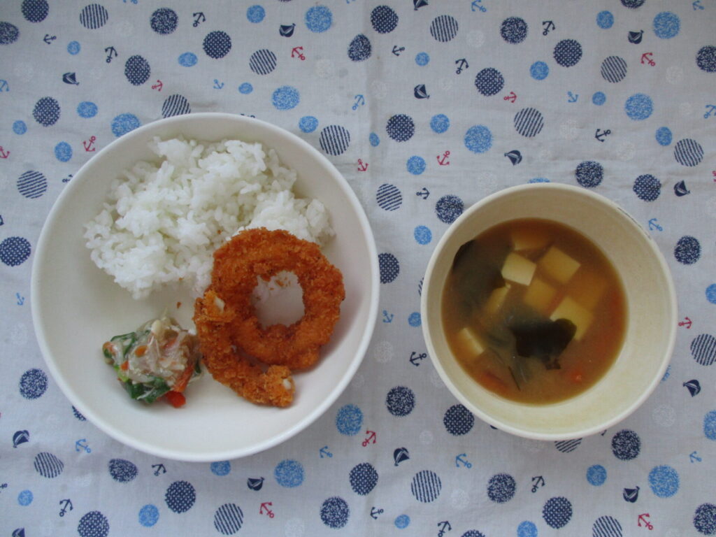 <今日の献立>ごはん・鶏ささみの梅かつお和え・イカリング・みそ汁