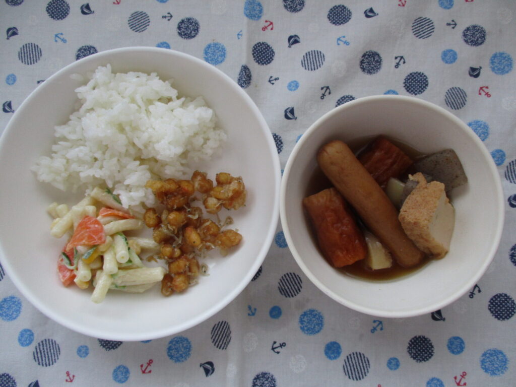 <今日の献立>ごはん・おでん・大豆の甘辛揚げ・マカロニサラダ