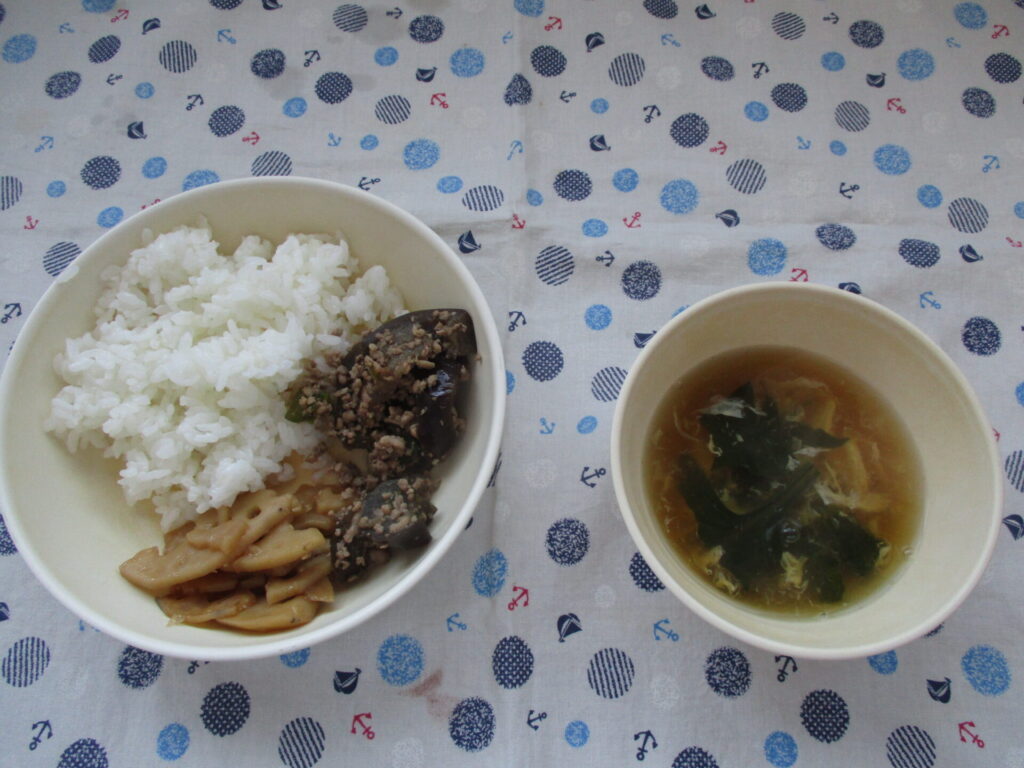 <今日の献立>ごはん・なすとピーマンのそぼろ炒め・れんこんのきんぴら・かき玉汁