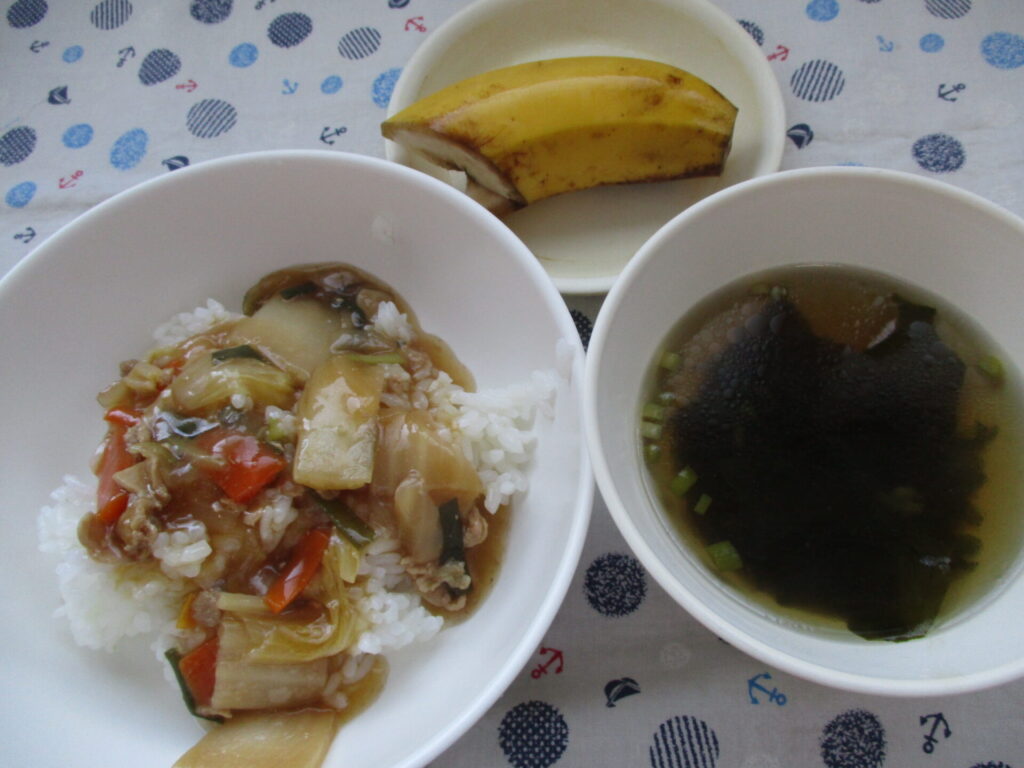 今日はソースカツ丼でした。ボリューム満点で、たくさんおかわりもしてくれました。付け合わせは大根ときゅうりの浅漬けで、塩昆布の味でさっぱりとして、揚げ物との相性が良かったです。
