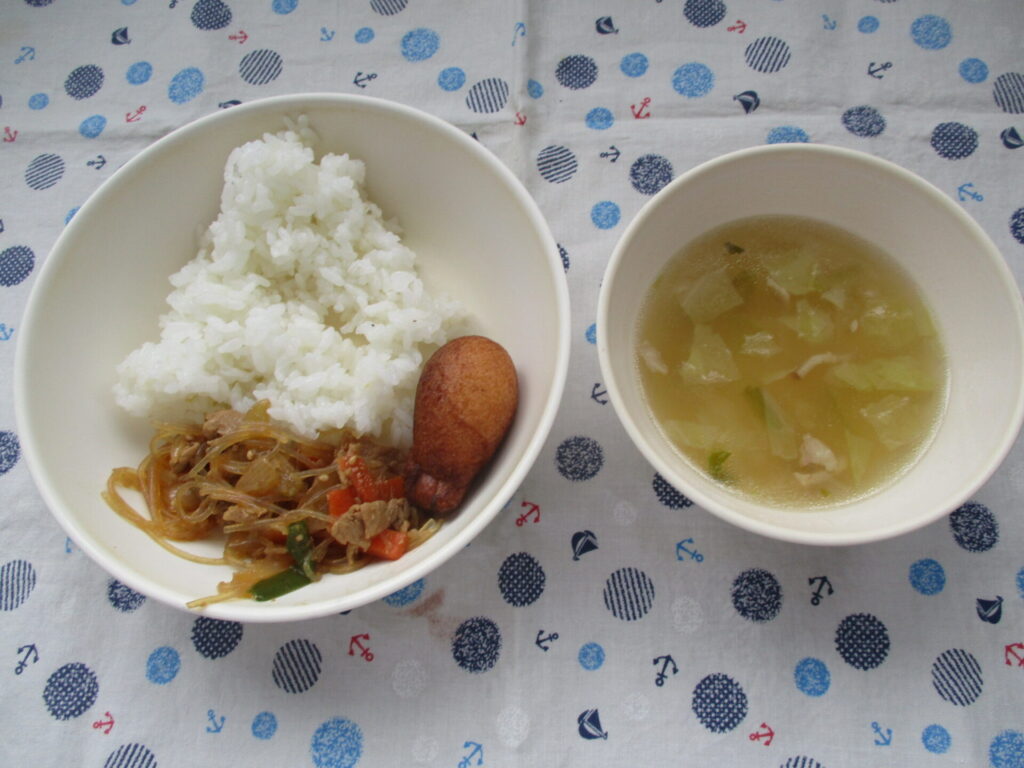 <今日の献立>ごはん・アメリカンドッグ・春雨のチャプチェ風炒め・あさりとベーコンのスープ