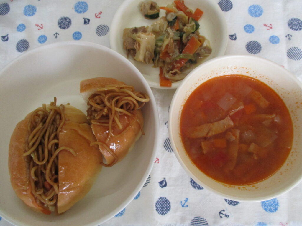 <12/16の献立>焼きそばパン・ミネストローネスープ・厚揚げのオイスターソース炒め