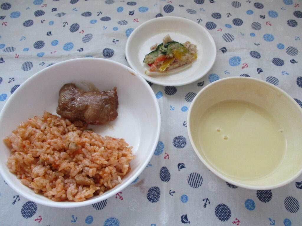 今日はカレーライスでした。明日の給食は何ですか?と子どもたちがよく声をかけてくれるのですが、カレーライスだよと伝えると、みんなとても楽しみにしてくれているようです。