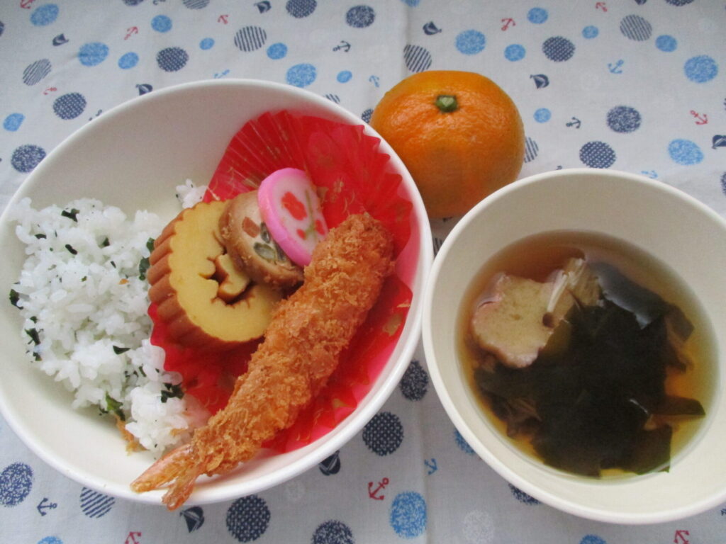 <今日の献立>わかめごはん・おせちの盛り合わせ・すまし汁・みかん