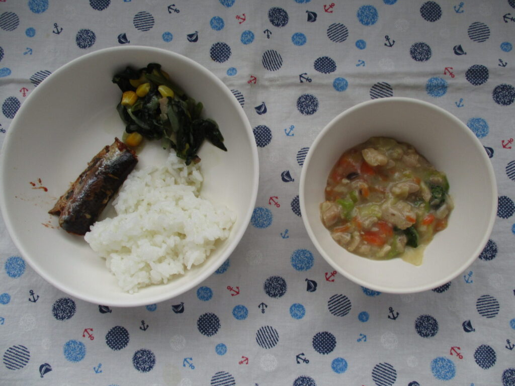 <今日の献立>ごはん・白菜のクリーム煮・ポパイソテー・いわしのトマト煮