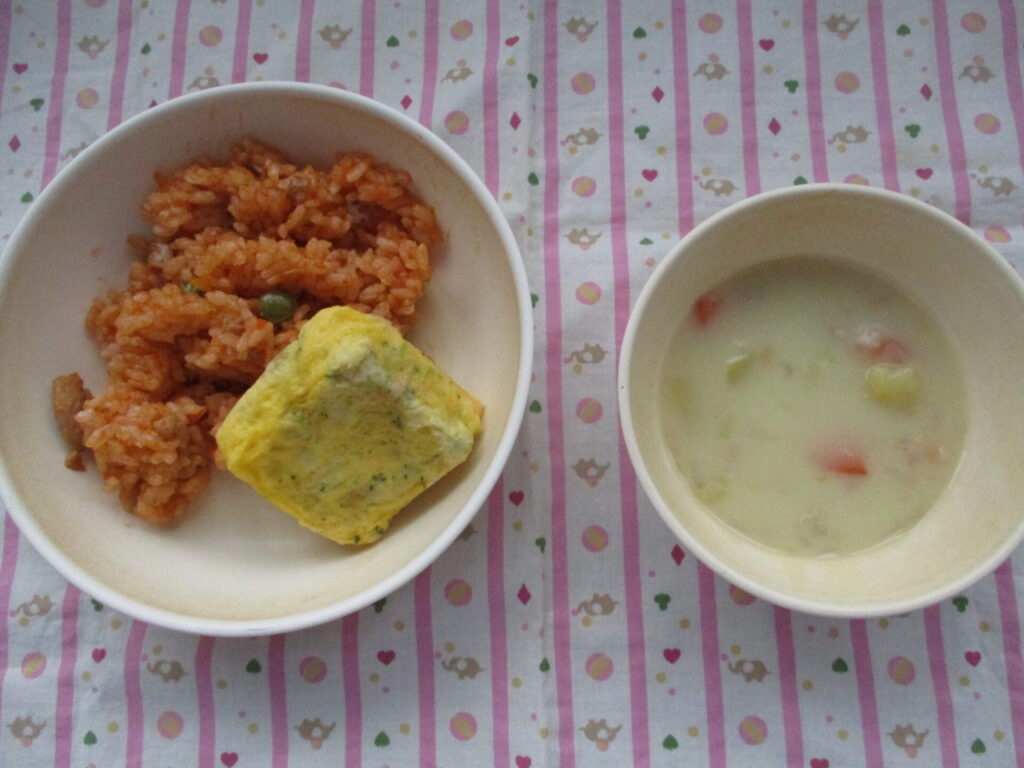 <今日の献立>チキンライス・スペイン風オムレツ・クリームシチュー