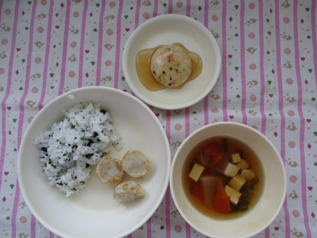 <今日の献立 わかめごはん・さといもの揚げ煮・豆腐のふわふわ・けんちん汁>