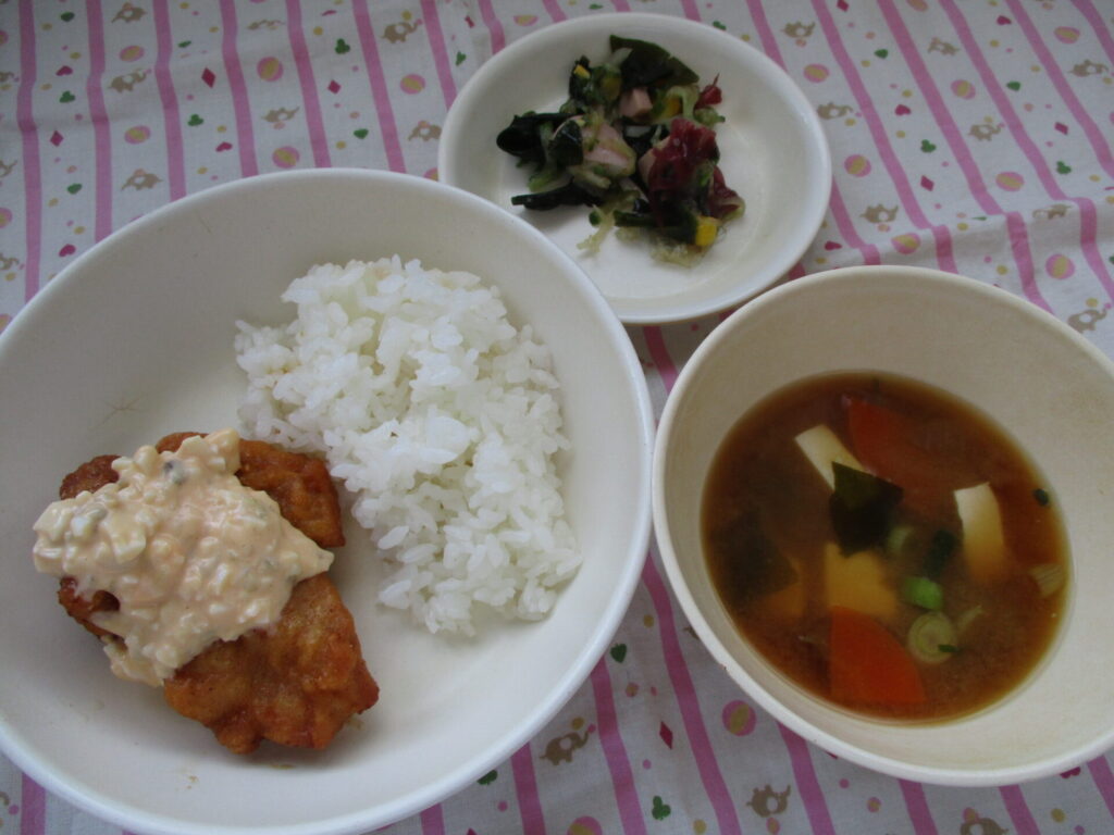 <今日の献立>ご飯・チキン南蛮・海藻サラダ・みそ汁