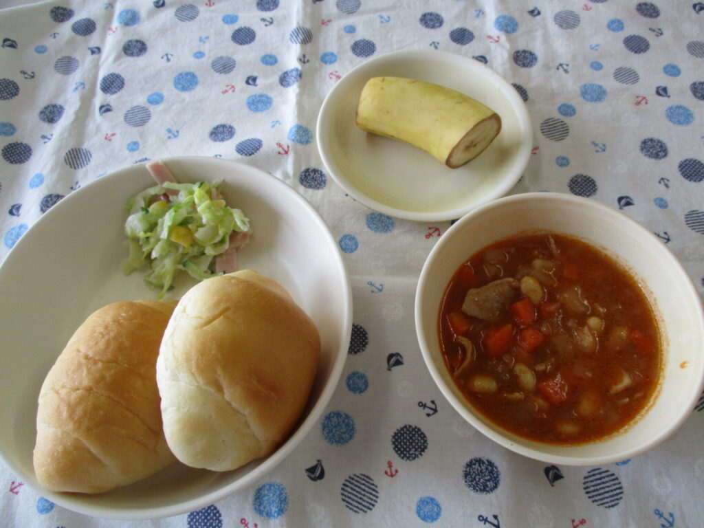 <今日の献立>ロールパン・ポークビーンズ・コールスローサラダ・バナナ