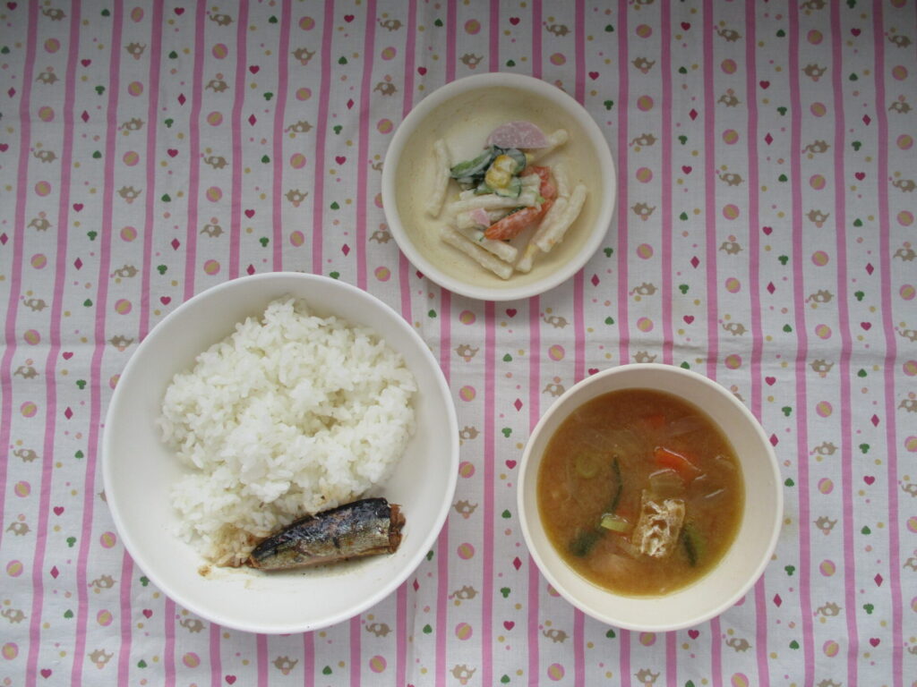 <今日の献立>ごはん・豚汁・マカロニサラダ・さんまのおかか煮