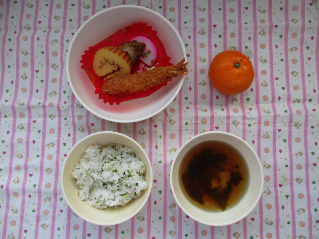 今日の献立♪菜飯、おせち盛り合わせ、すまし汁、みかん