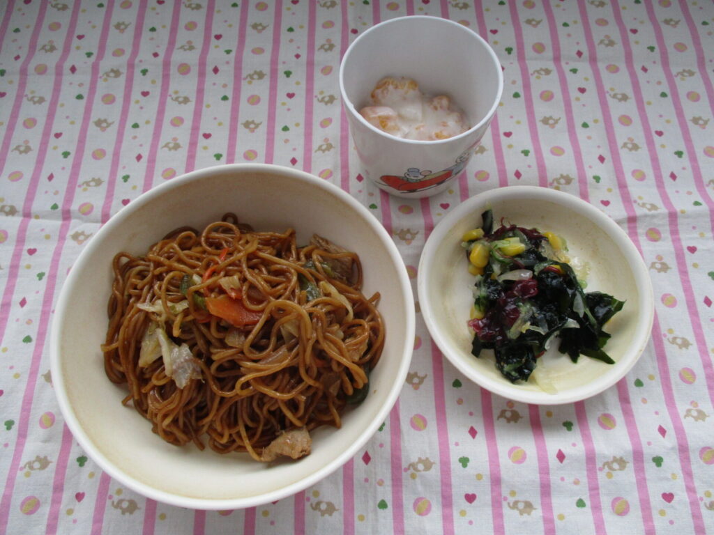 <今日の献立>焼きそば・海藻サラダ・フルーツヨーグルト