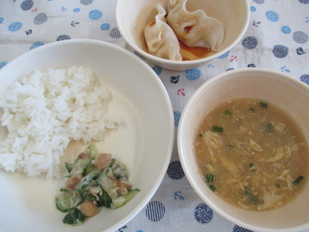 <今日の献立>ごはん・水餃子・キュウリとささみのサラダ・中華風コーンスープ