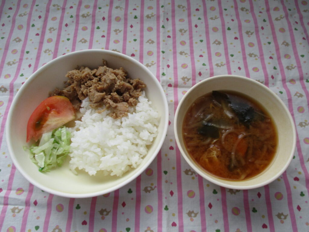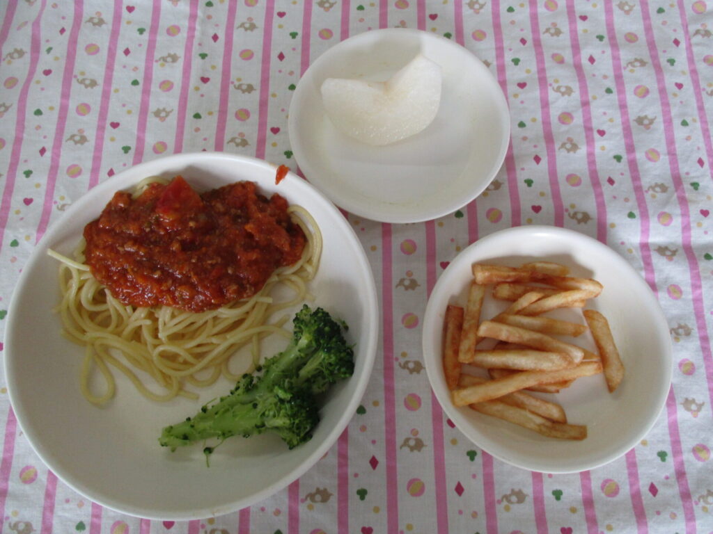 今日はミートスパゲティでした。ピーマンも入っていたのですが、他の野菜と一緒にしっかりと炒められていて、ピーマンが入っているとは気付かないくらいだったので、苦手な子も食べやすかったのではないかと思います。フライドポテトも人気でたくさんおかわりしていました。旬の梨も甘くて美味しかったです。