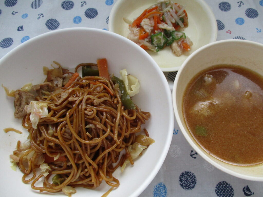<今日の献立>やきそば・鶏ささみの梅かつお和え・豚汁