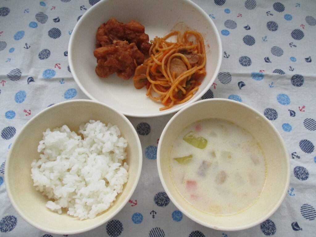 <今日の献立>ごはん・から揚げ・ナポリタンスパゲティ・クラムチャウダー