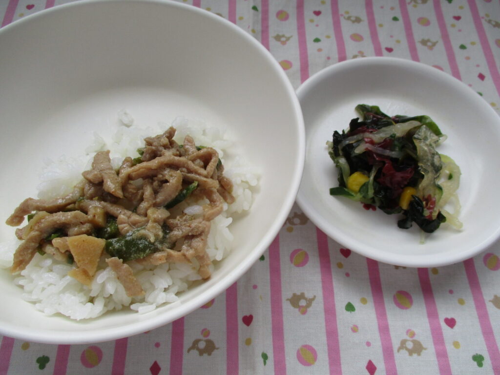 <今日の献立>チンジャオロース丼・海藻サラダ