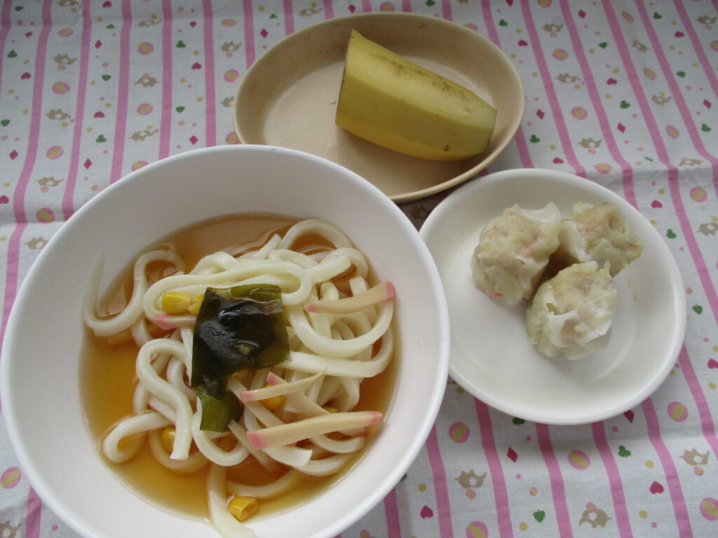 <今日の献立>かけうどん・シュウマイ・バナナ