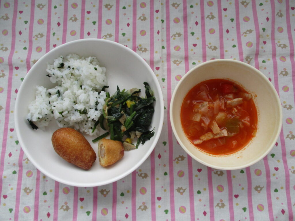 <今日の献立>わかめご飯・アメリカンドッグ・ポパイソテー・ミネストローネスープ