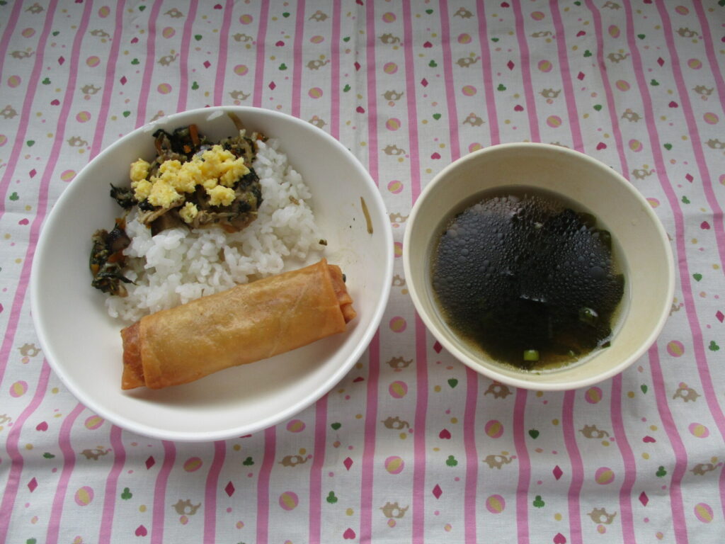 今日の献立>ビビンバ・わかめスープ・春巻き
