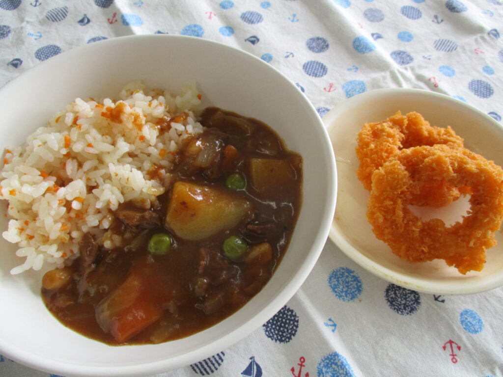 <今日の献立>にんじんピラフ・ビーフシチュー・イカリング