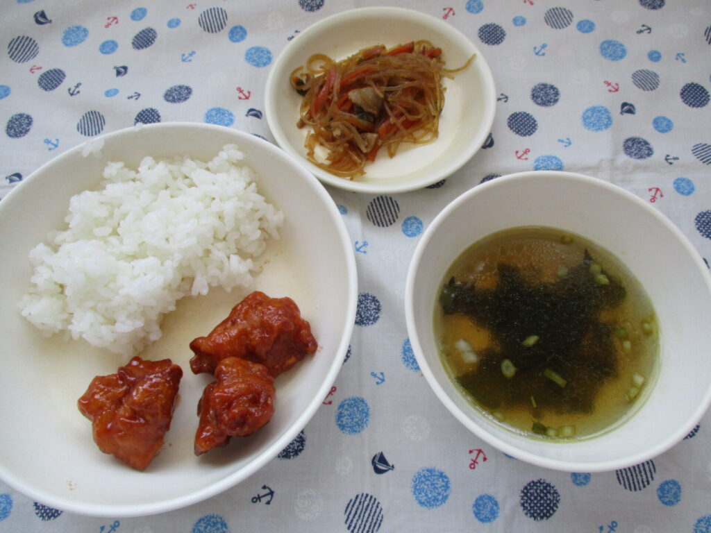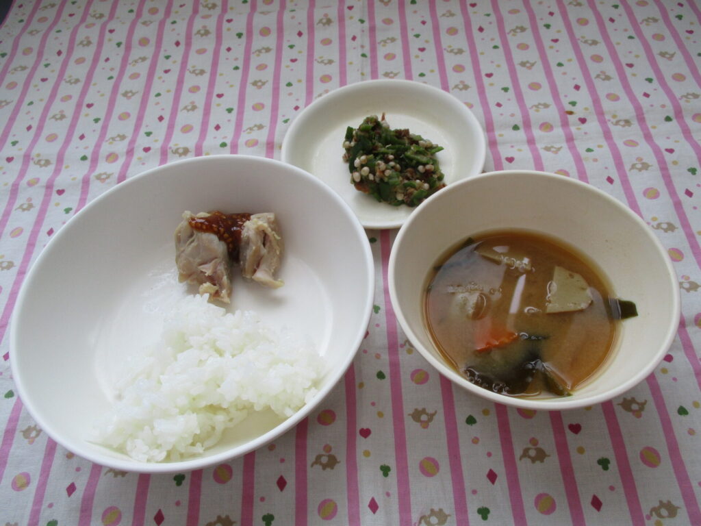 <今日の献立>ご飯・茹で鶏のごまみそ和え・オクラのおかか和え・みそ汁