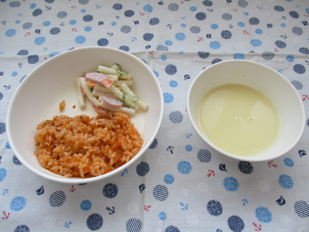 <今日の献立>チキンライス・マカロニサラダ・コーンスープ