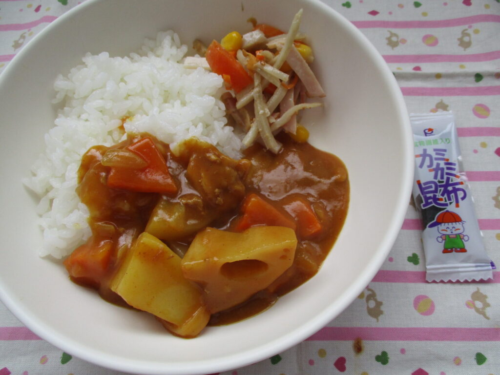 <今日の献立>根菜カレー・ごぼうサラダ・カミカミ昆布